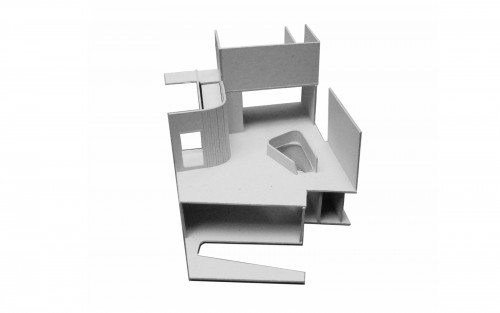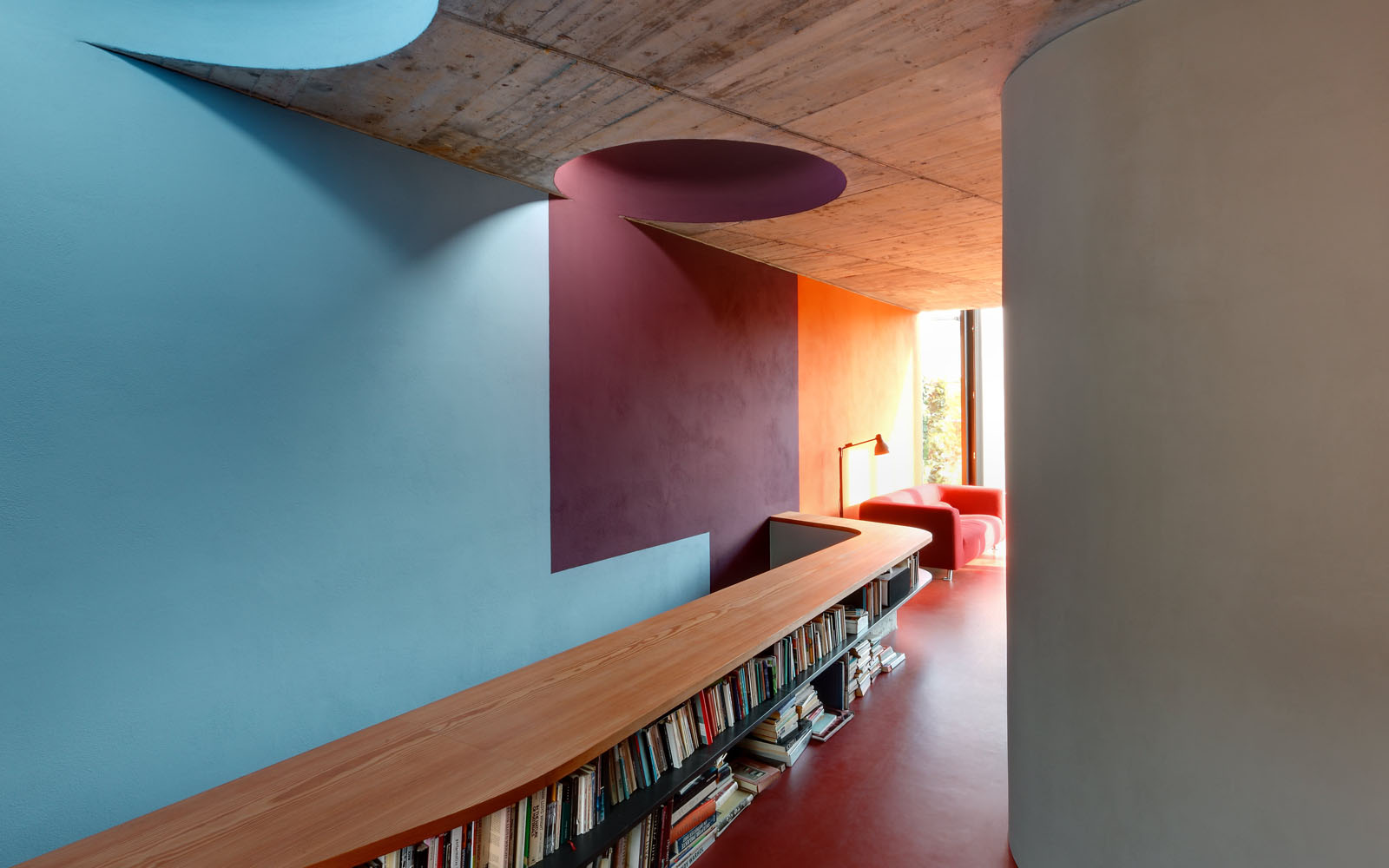 Das Haus FL interpretiert die Idee des Einraumhauses neu. Die alle Orte verbindende Promenade verläuft von der Halle des Erdgeschosses über eine einläufige Treppe und endet auf dem Dach des Hauses mit dem Blick über Berlin. Der Wechsel von offenen und introvertierten Orten ist Abbild des familiären Lebens der Nutzer.