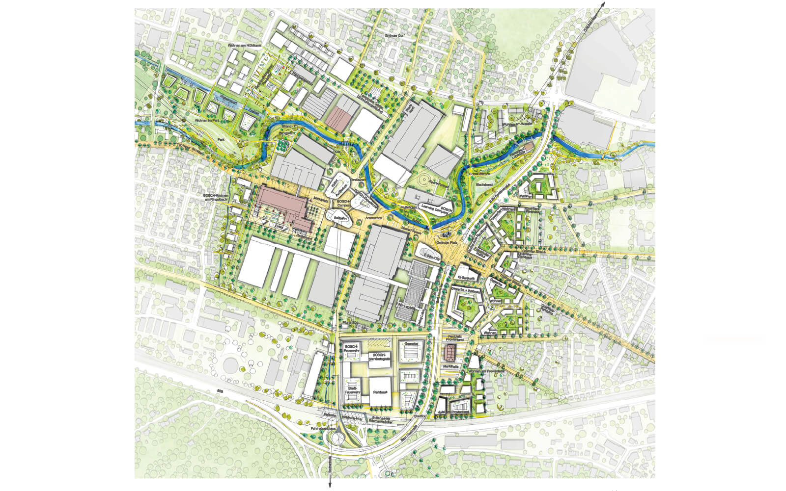 Auf Basis des bestehenden Masterplans zur Standortentwicklung der Firma BOSCH in Reutlingen entwickelt die AIG mit Ihren Partnern ein umfassendes Durchwegungs- und Verzahnungskonzept zur Attraktivierung von öffentlichen, halböffentlichen und privaten Freiflächen rund um den BOSCH-Standort, sowie durch den Standort hindurchwirkend und entlang dem im Konzept weitgehend renaturierten Echaz-Lauf. Die im Masterplan angelegte Idee der Grenzauflösung zwischen BOSCH und Stadt, zwischen Stadt und BOSCH wird durch einen großzügigen Shared-Space im Teilverlauf der Tübinger Straße und – perspektivisch – künftig bis in die Altstadt zur größtmöglichen Attraktivität für die Öffentlichkeit entwickelt.