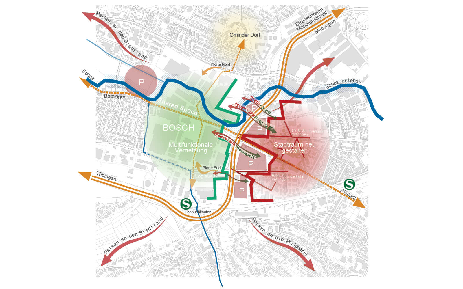 Zusammen mit dem Neuen Zentralgebäude des BOSCH-Standorts spannt die bauliche Verdichtung um den neuen „Gminder Platz“ einen großzügigen Freiraum unter Einbeziehung der Echaz auf, flankiert von den öffentlichkeitswirksamen Gebäuden der BOSCH Learning Company und E-Bike-City sowie der andienenden Seilbahnstation. Es entsteht ein großflächiger Shared Space, eine Bühne für die Mobilität von morgen. In 2. Reihe verwebt sich die flankierende Bebauung der Bantlinstraße mit einer neuartigen Verdichtungstypologie – der „Scholle“ – frei und ungezwungen mit den lockereren bestehenden Randbebauungen zu einer bruchfreien Stadtraumergänzung.