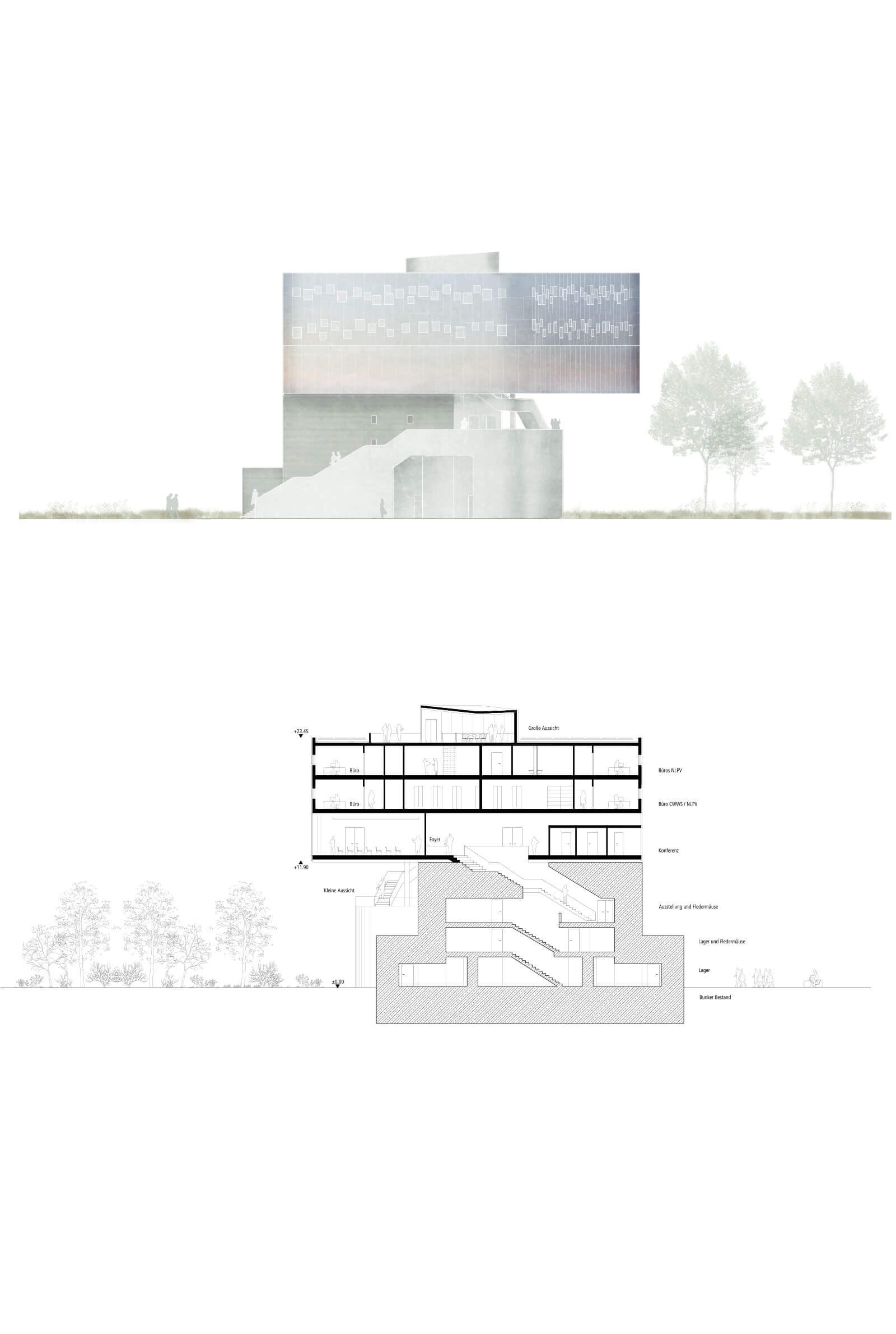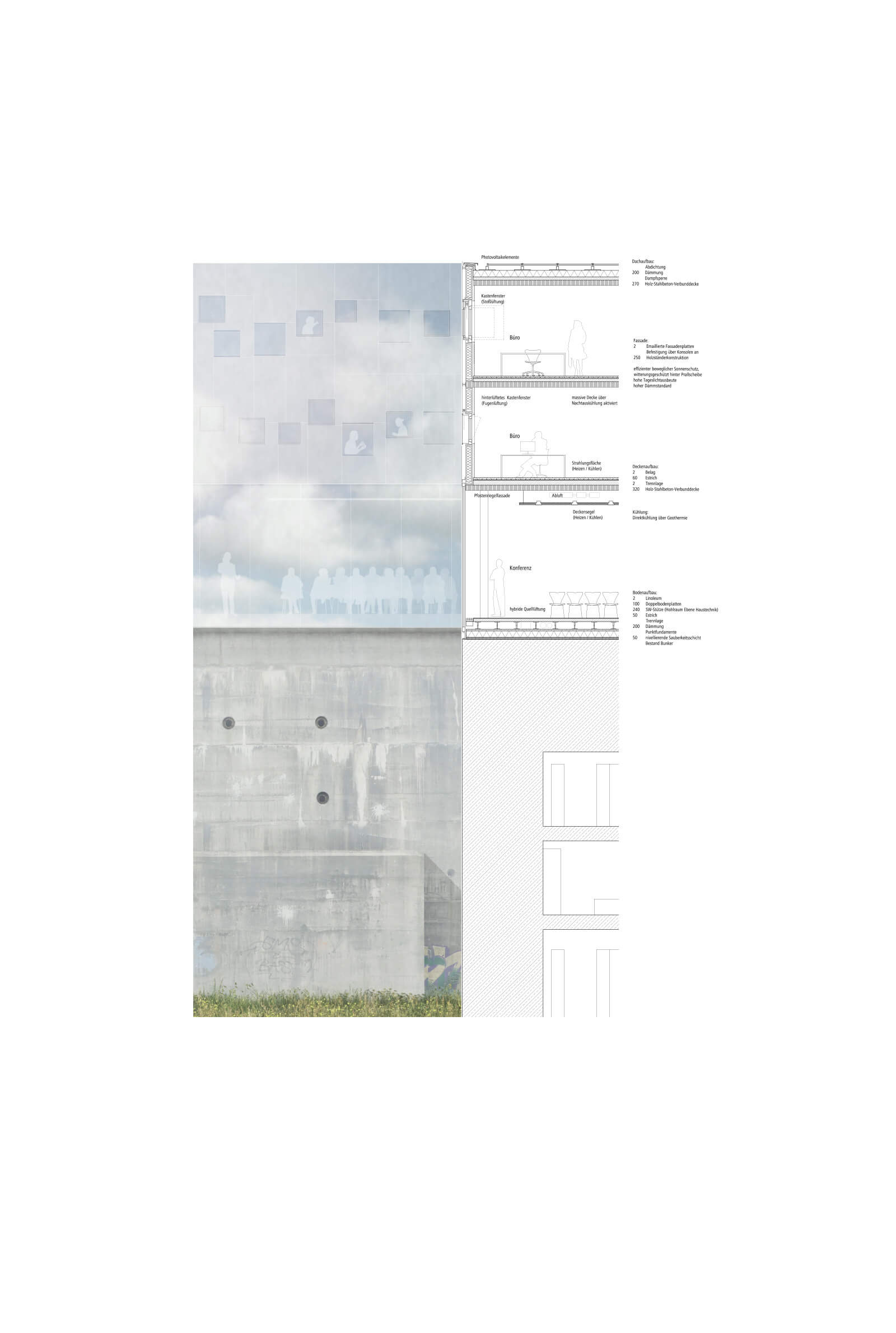 Der „Superform“ des massiven Bunkerquaders stellen wir zunächst die „Kleine Aussicht“ gegenüber. Dieses eigenständige auf dem Boden geerdete Bauteil in Form einer geschwungenen Wand, bildet die Haupterschließung zu dem auf dem Bunker mit Leichtigkeit balancierenden TWWP, das auch athmospärisch der Schwere der Geschichte eine optimistische, leichte Zukunftsvision entgegenstellt.
