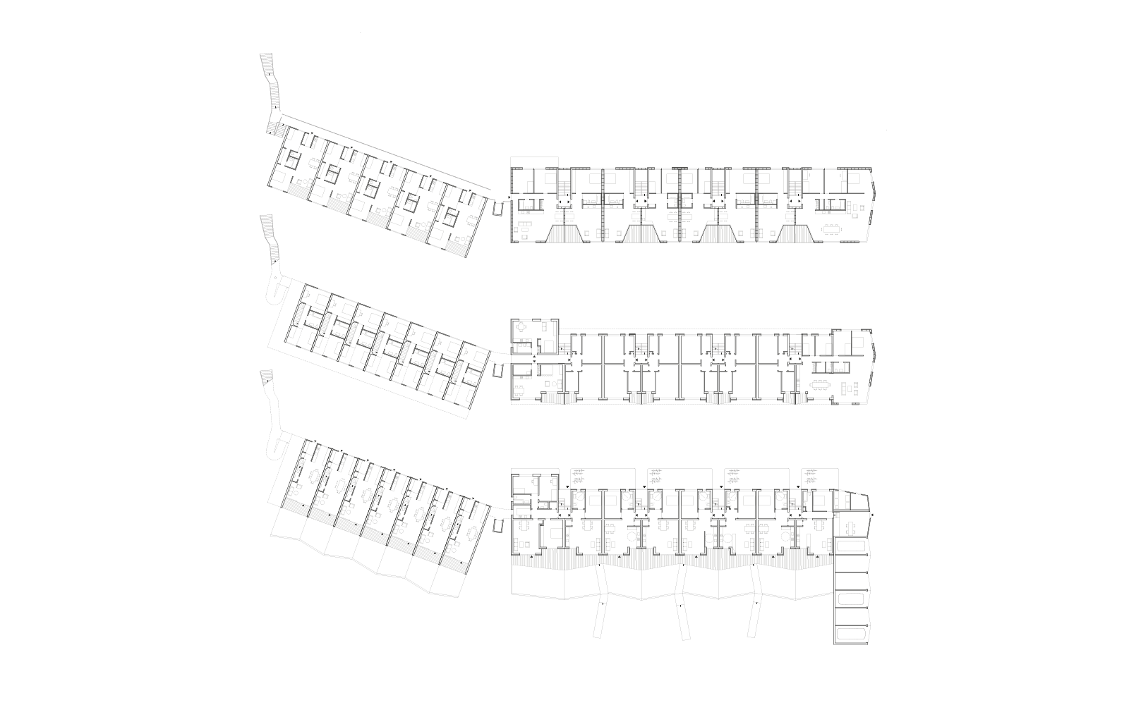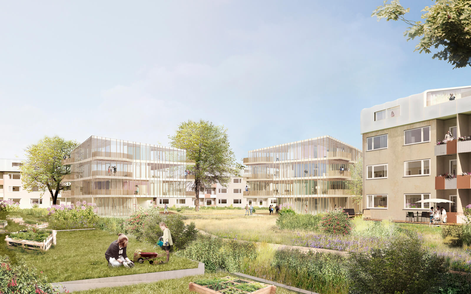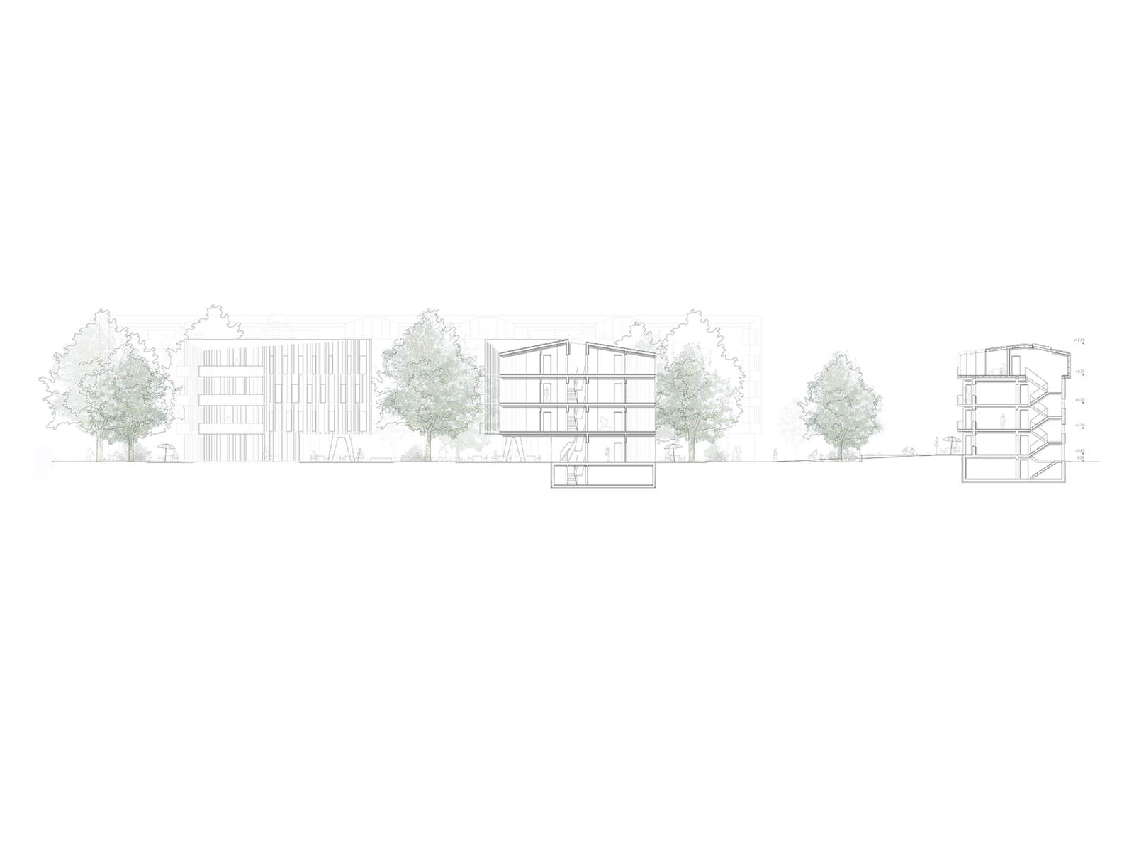 Eine Dachaufstockung wird für alle Bestandsbauten vorgesehen. Vier Punkthäuser innerhalb der Zeilen und anstelle des nordwestlichen Garagenhofs verdichten die Struktur. Zwei der Bestandszeilen werden verlängert und bieten weitere Wohnformen, wie Reihenhäuser und großzügige Laubengangwohnungen. Ziel ist das Bild eines kleinteilig gestalteten Landschaftsparks, der wechselnde und überraschende Blickbeziehungen zulässt. Die Aufenthaltsqualität wird durch die bessere Erlebbarkeit und Nutzung der Grünräume zwischen den Häusern durch privatere Zonen, vielfältige dezentrale Aufenthaltsbereiche und großzügige Spielwiesen gestärkt. Es werden bewusst mehrfachkodierte Räume geschaffen, die bewusst das „sowohl als auch“ zulassen und dazu auffordern gemeinsam genutzt zu werden.